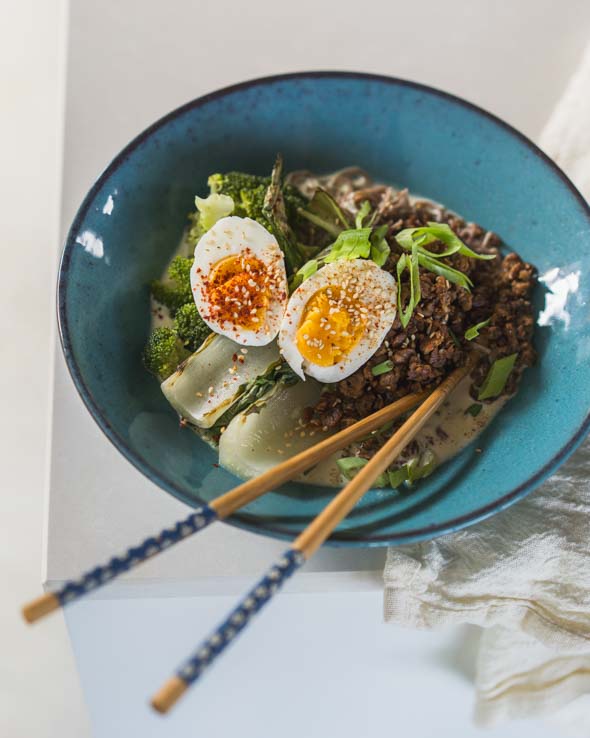 Een eenvoudige versie van Tantanmen ramen, voor de gelegenheid klaargemaakt met vegan gehakt. Heerlijk én eenvoudig!