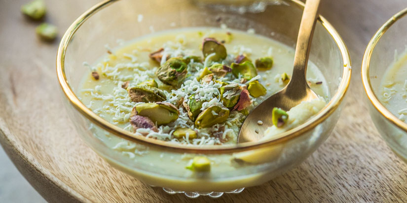 - Werk net voor het serveren af met fijngehakte pistachenoten en geraspte witte chocolade